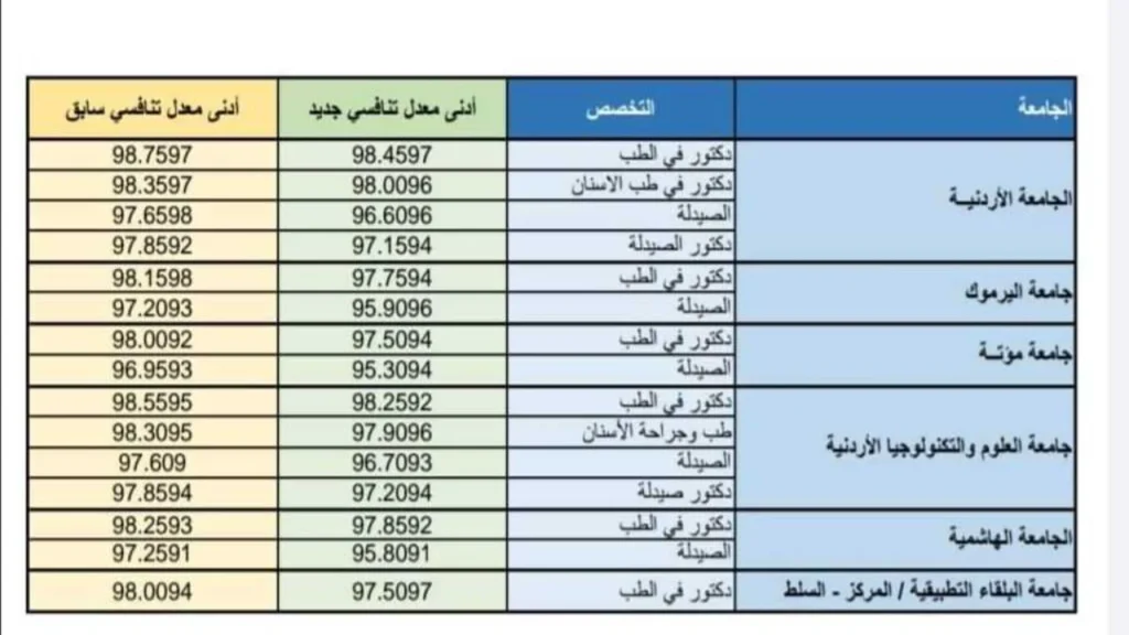 معدلات القبول الموحد في الاردن أكثر ما تهتم بها وزارة التعليم العالي في الأردن خلال الفترة الحالية، ولكي تنتهي الوزارة من هذه المهمة التي تحدد مصير كل طلاب الثانوية العامة الأردنية، استعانت بمجموعة من الاستشاريين والمتخصصين وهم، يحددون المجموع المناسب للالتحاق بكل كلية، وبالفعل تم الانتهاء على معدلات القبول التالية في مجموعة من الكليات كالتالي: