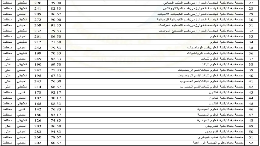 فيما يلي بعض التفاصيل الدقيقة لمعدلات القبول في مختلف التخصصات والجامعات العراقية: