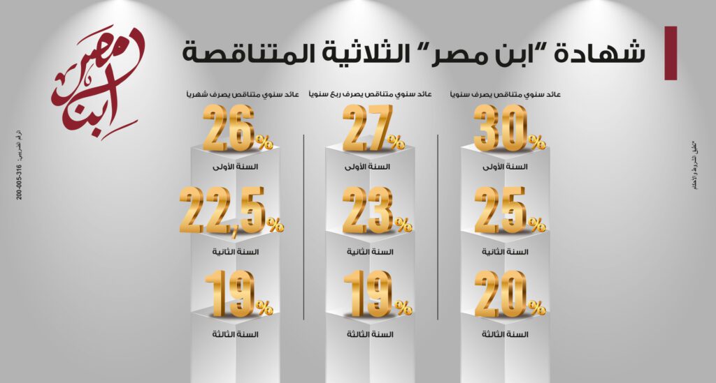 تتيح شهادة ابن مصر الثلاثية المتناقصة العديد من الخيارات المتنوعة التي تتناسب مع احتياجات العملاء وتتدرج نسبة العائد على مدار الثلاث سنوات بشكل متناقص، وفيما يلي إليك التفصيل: